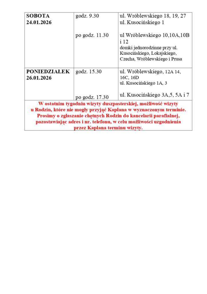 W czasie trwania wizyty duszpasterskiej (od 29.12.2025 r. do 31.01.2026 r.) kancelaria parafialna w soboty będzie nieczynna.